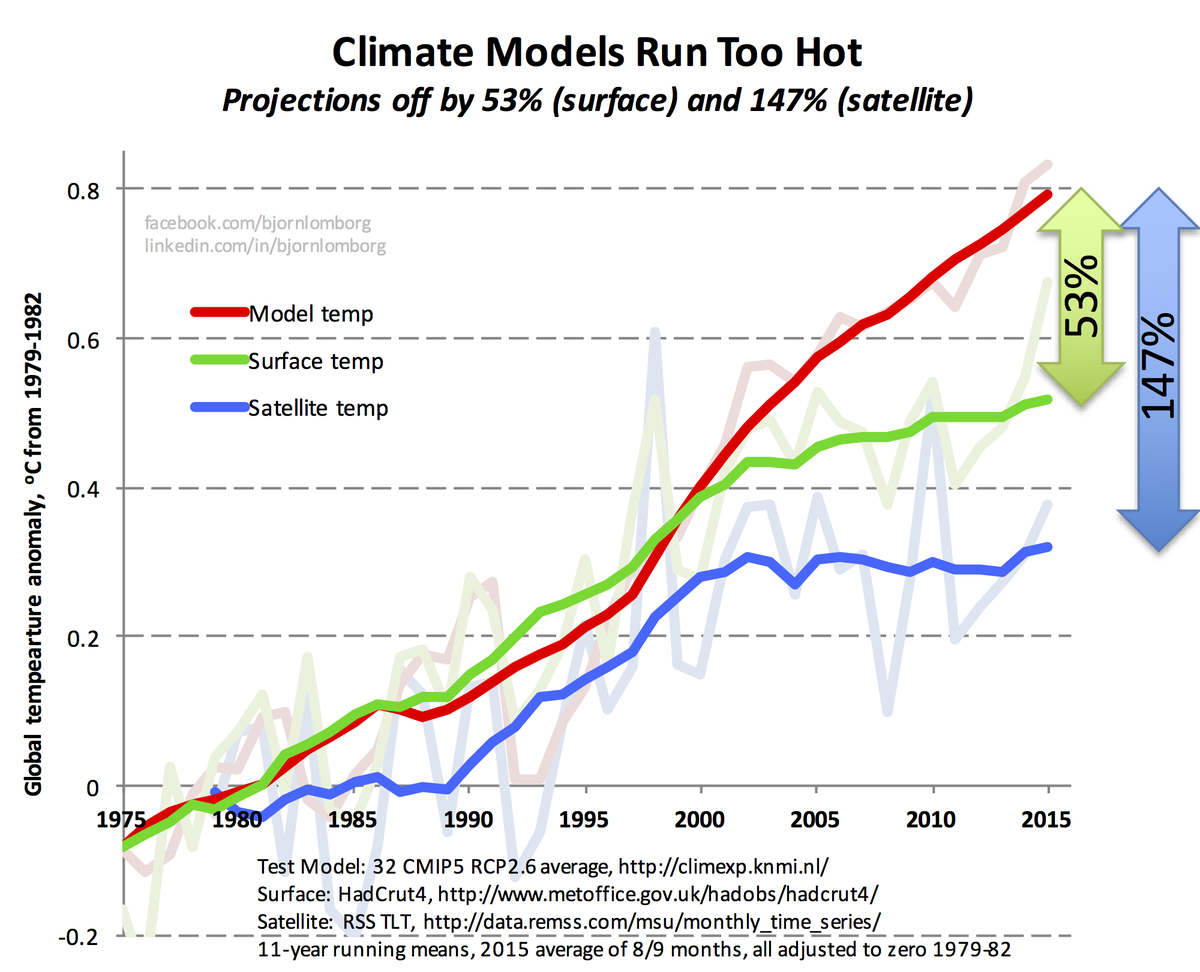 @BjornLomborg:Current climate models run too hot: 53% above surface temp147% above satellite http://ow.ly/U67Vh pic.twitter.com/C4ii00meBN