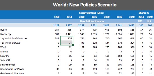 Seeing table likely from the @IEA's World Energy Outlook, and that much of today's biomass usage mostly due to ~2.5 billion of the world's people still "cooking over open fires using solid biomass as fuel," plus some heating uses. (No response expected, if that's accurate.)