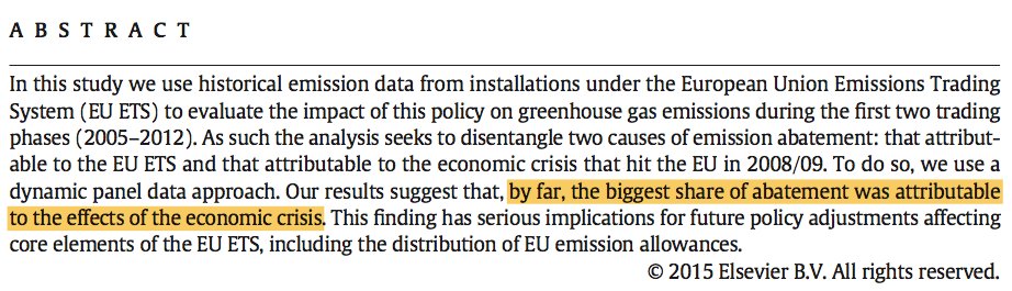 By far, the main reason for EU CO₂ reductions? The economic crisis, not climate policy http://www.sciencedirect.com/science/article/pii/S0140988315001061 …pic.twitter.com/BP3S9kMoqz