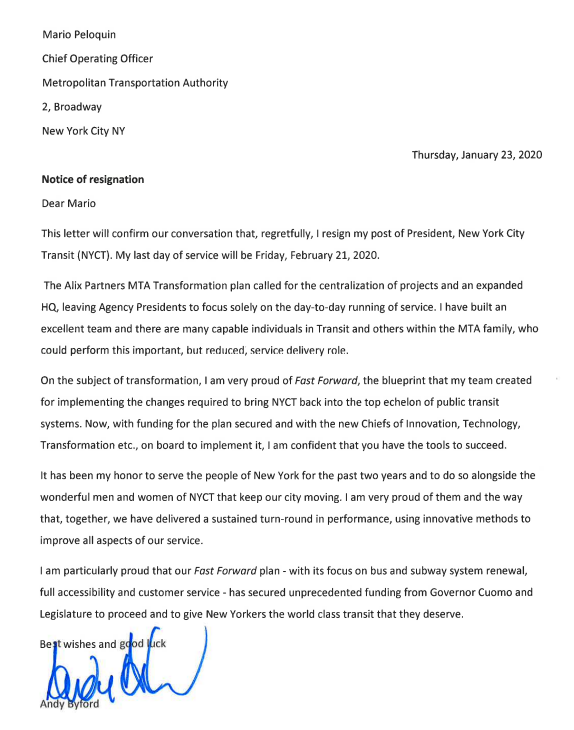 MTA just released Byford's latest resignation letter. He cites Gov. Cuomo's reorganization of the agency as a reason to quit. It "called for the centralization of projects and an expanded HQ, leaving Agency Presidents to focus solely on the day-to-day running of service."pic.twitter.com/qlfOloyIDr