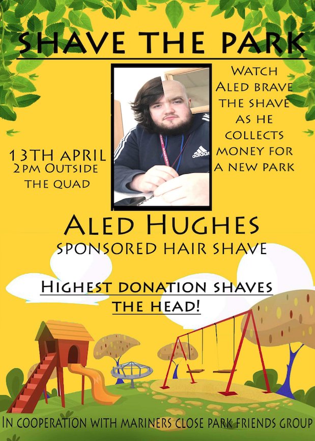 It's nearly time for upper sixth student, Aled, to ‘Brave the Shave’. To sponsor Aled, fill in a sponsorship form at Reception or visit our ‘Brave the Shave’ sponsorship stall on the 9th of April at 12.00pm - 1.00pm in the foyer. Highest donation shaves Aled’s hair!pic.twitter.com/sEhqqJtXbU