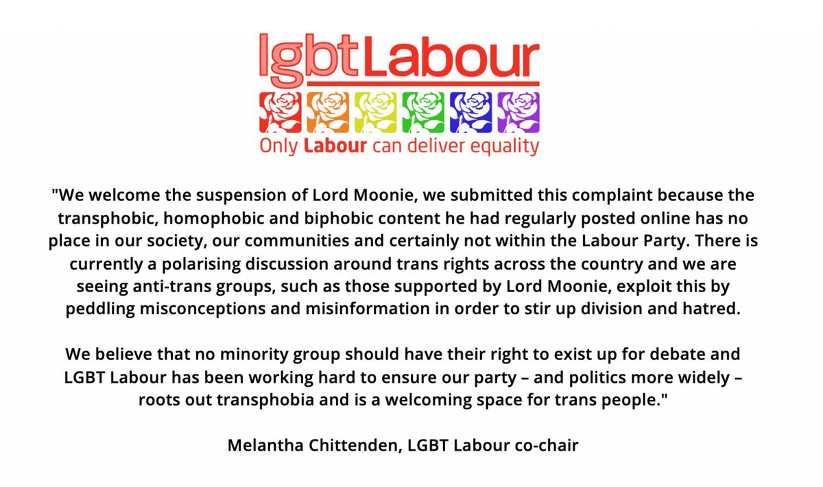 We welcome the suspension of Lord Moonie, following the complaint we made about his anti-LGBT behaviour - the transphobic, homophobic and biphobic content he had regularly posted online has no place within the Labour Party. Read our full statement below 👇pic.twitter.com/NHVUiseoEe