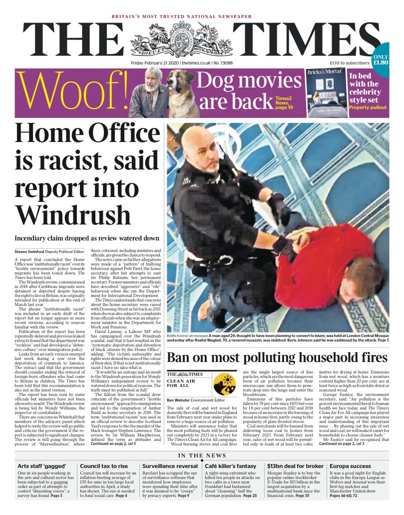 THE TIMES: Home Office is racist, said report into Windrush #TomorrowsPapersToday pic.twitter.com/xlqPueA9VD