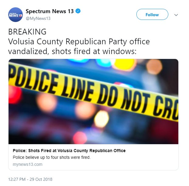Gunfire against Republicans is vandalism.https://twitter.com/JackPosobiec/status/1056966755845894144 …