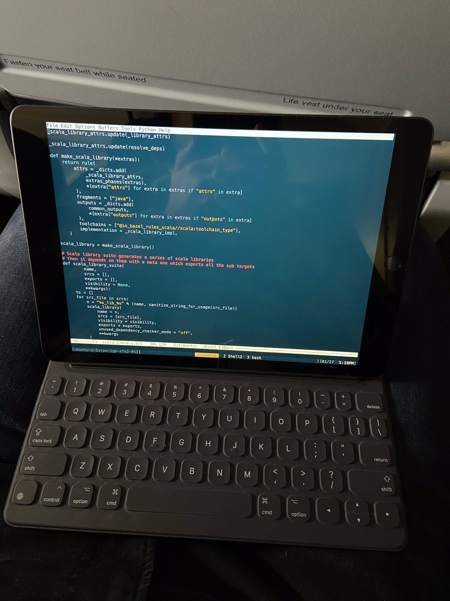 Coding at 28,000 feet on an iPad over a mosh connection. The future is pretty neat (and pretty cramped).pic.twitter.com/sQa6c1oGwB