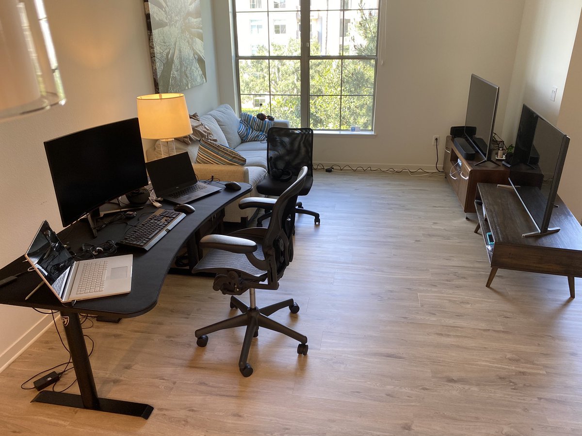 Temp housing living room of a quarantined gamer without adult supervision (aka my wife). Thankful to have my oldest son as my roommate through this.pic.twitter.com/ceYjy5YA7V