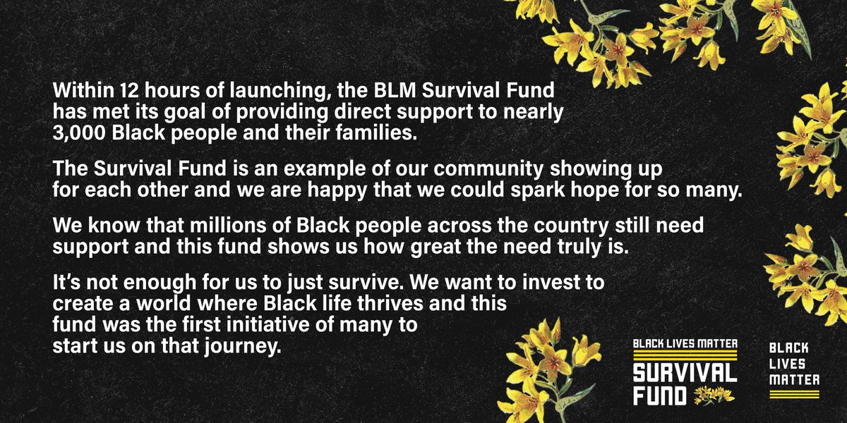 #BLMSurvivalFund reached its goal of providing cash relief to nearly 3,000 Black ppl within just 12 hrs of launching. It’s clear there is so much need out there. This was our 1st initiative at investing in Black communities—we don't just want to survive. We want to thrive