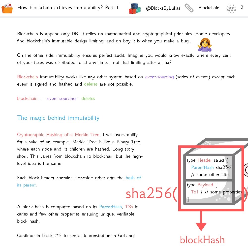 How blockchain achieves immutability? What a Sunday! Let me know what you think or if you have any questions! Block 3 will be posted tmr with a run-able demonstration in GoLang ;) #blockchain #programming #technologypic.twitter.com/RjOQZwNZZv