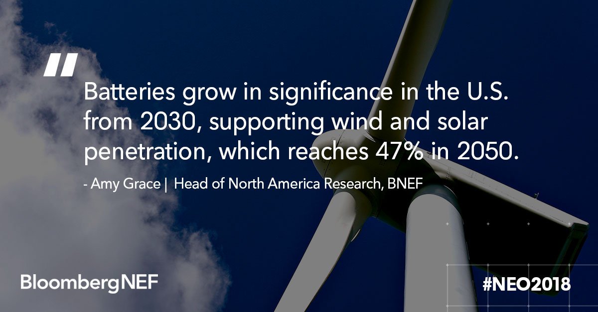 #NEO2018: Wind & solar will surge to almost “50 by 50” – 50% of world generation by 2050 – on the back of precipitous reductions in cost & the advent of cheaper batteries that enable electricity to be stored & discharged to meet shifts in demand & supply. https://bloom.bg/2N6y5LW pic.twitter.com/dGwpltHptZ