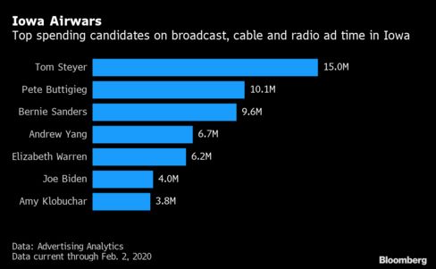 The most recent numbers on political ad buys in Iowa show Tom Steyer spending the most, followed by Pete Buttigieg and Bernie Sanders