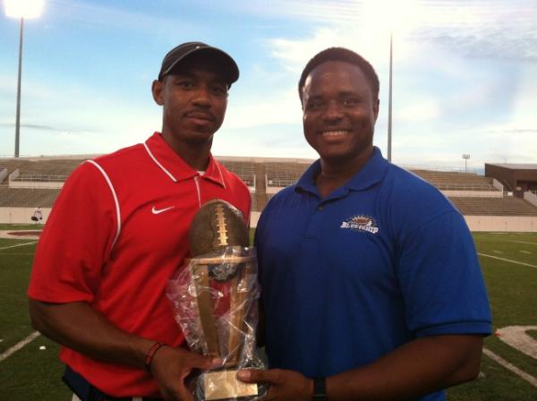 Aldine's & North team head coach Lionell Crawford accepting a game award from pr director Isaiah Patterson.pic.twitter.com/eoZkz06L