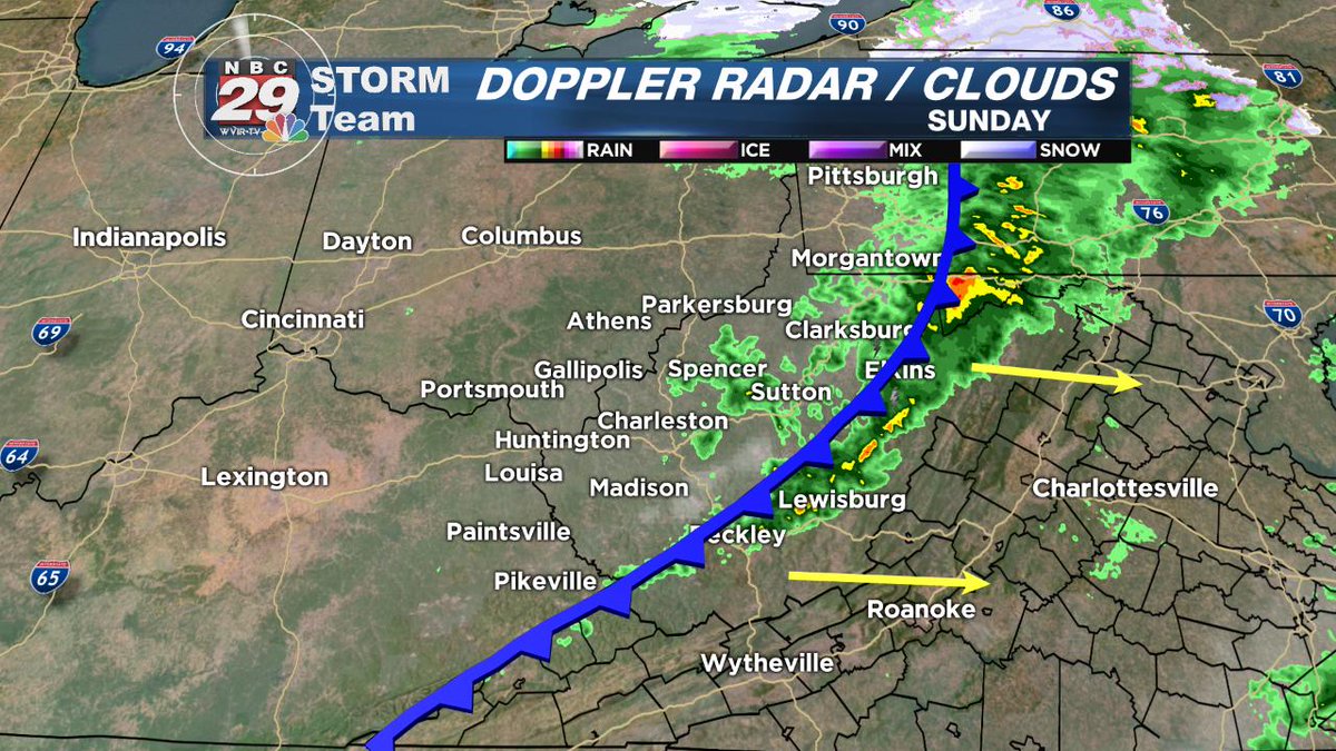 Cold front continues to exit the Appalachians this Sunday morning. Clouds and sun with highs in the lower 60s for the Ohio, Big Sandy & Kanawha Valley this afternoon. Partly cloudy tonight. Lows 40s. Partly sunny and windy at times Monday. High 80 degrees.