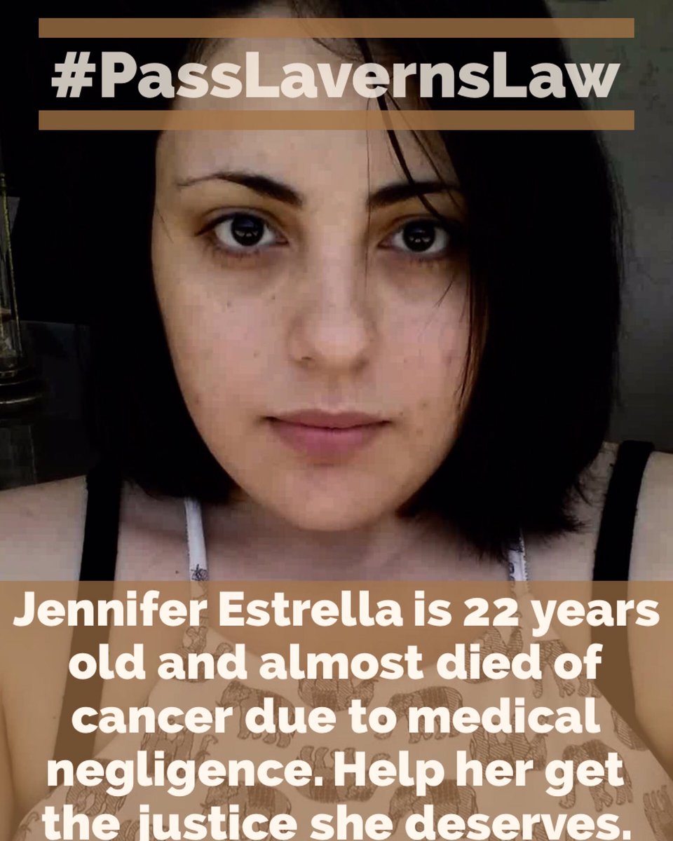 Jennifer Estrella is 22 years old and almost died of cancer due to medical negligence. She supports #LavernsLaw.pic.twitter.com/OjBMRJNGL7
