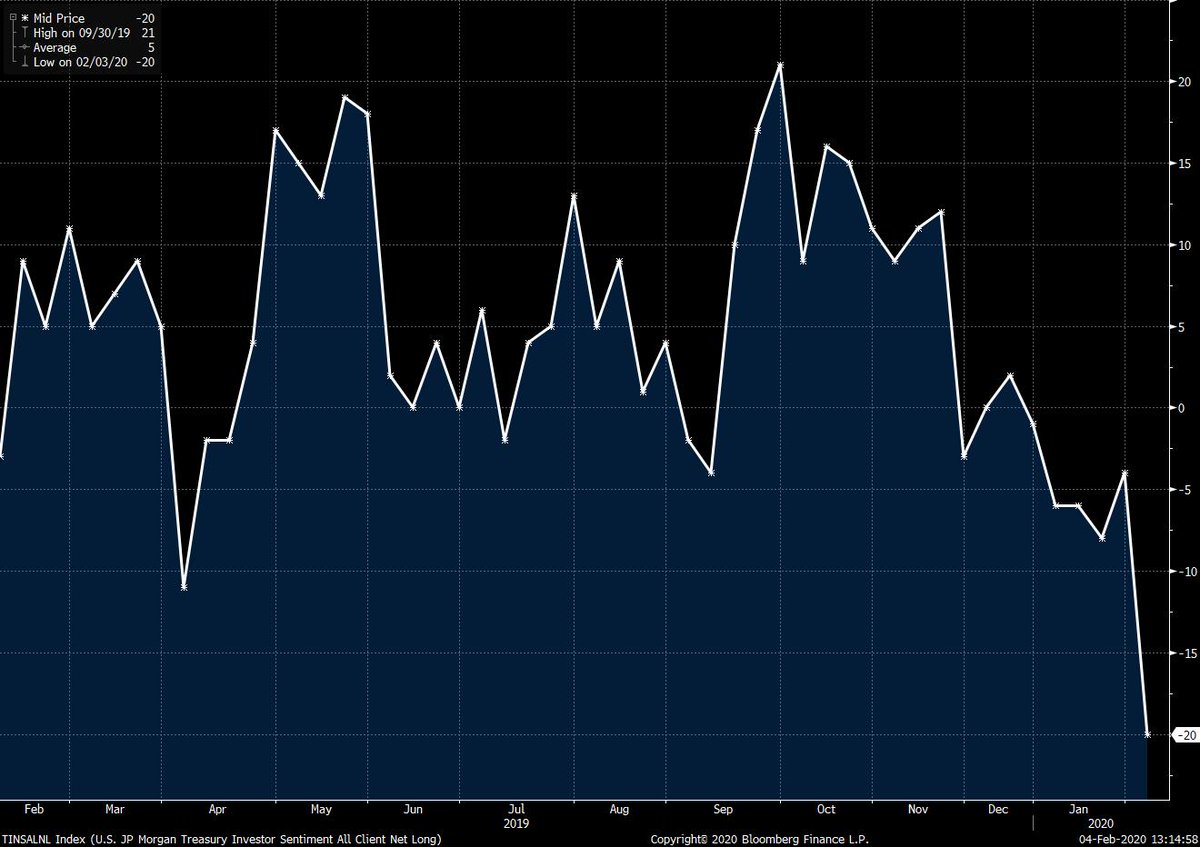 Not a lot of conviction in the recent bond rally. JPMorgan's widely-followed weekly sentiment index just had one of its biggest declines in years. It's at its lowest since Sept. 2018. That's the bad news. The good news is that's just when the bond market began a long rallypic.twitter.com/cv4WPEDB80