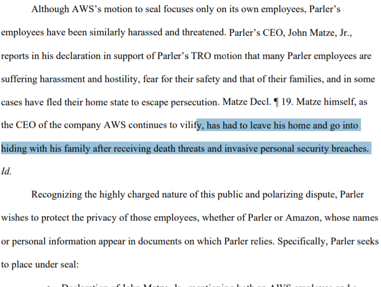 Wow: Parler CEO John Matze has fled his home with his family and they all have gone into hiding after receiving "deaths threats" and "invasive personal security breaches," according to a new filing from Parler's lawyers in the suit with AWS.pic.twitter.com/pRSbkCPWIu