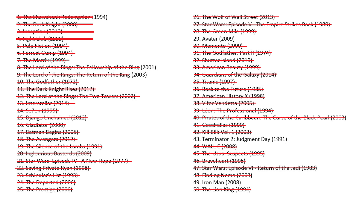 I've seen all of them except the ones with "Lord of the Rings" in the title.