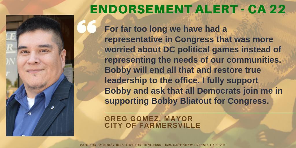 Honored to receive the endorsement of #Farmersville Mayor Greg Gomez for my campaign to turn #CA22 Blue in 2020. Its time to restore leadership in Congress and send #DevinNunes home. https://bobbybliatout.com/latest-news/2019/6/22/farmersville-mayor-greg-gomez-endorses-bobby-bliatout-for-congress …pic.twitter.com/lcX4YjrSdw
