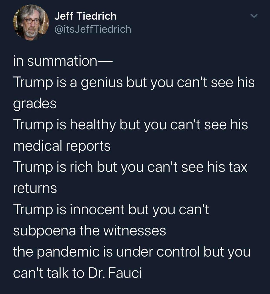 Not only does he hide records from BEFORE he became president, he also hides records of his work AS president, defies subpoenas and fires IGs who can hold him accountable.