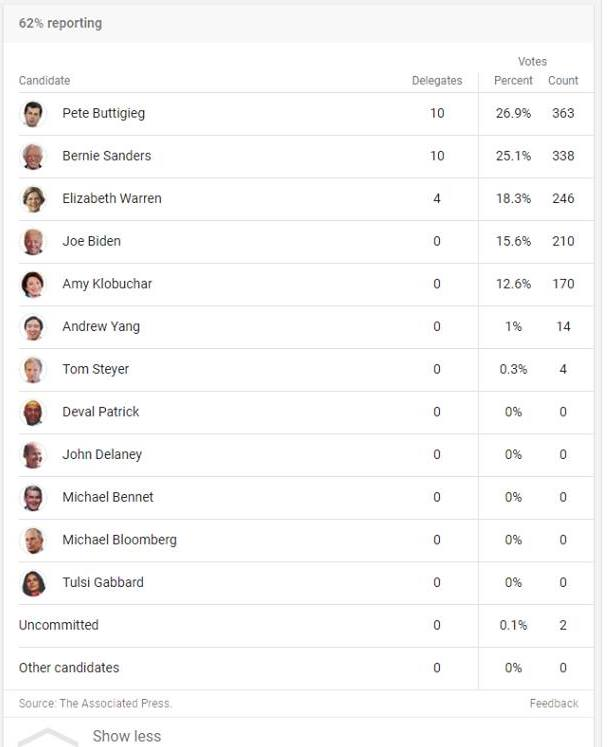 Iowa's early numbers (62% in) show: * Sanders currently has the most votes if it were a primary (raw vote) * Buttigieg currently has the most delegates (after alignment) * They are in the Top 3 with Warren * Biden in 4th - Klobuchar behind him by just 2k votes