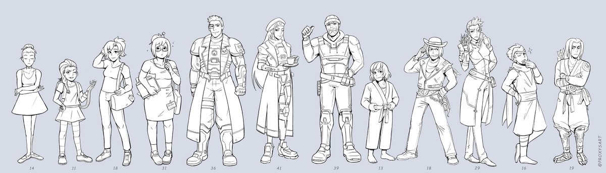 A lineup of some Overwatch characters 19 years before the current game takes place. I'd done this a while ago but never posted it so here it is! (their ages are listed below them)