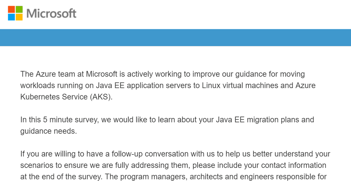 The perfect holiday gift? How about working with my team directly for free to help migrate Java EE workloads to Azure? If interested, fill in this five minute form. https://microsoft.qualtrics.com/jfe/form/SV_b903dEDAOzbiXDT …pic.twitter.com/5Wy20bPkJ9