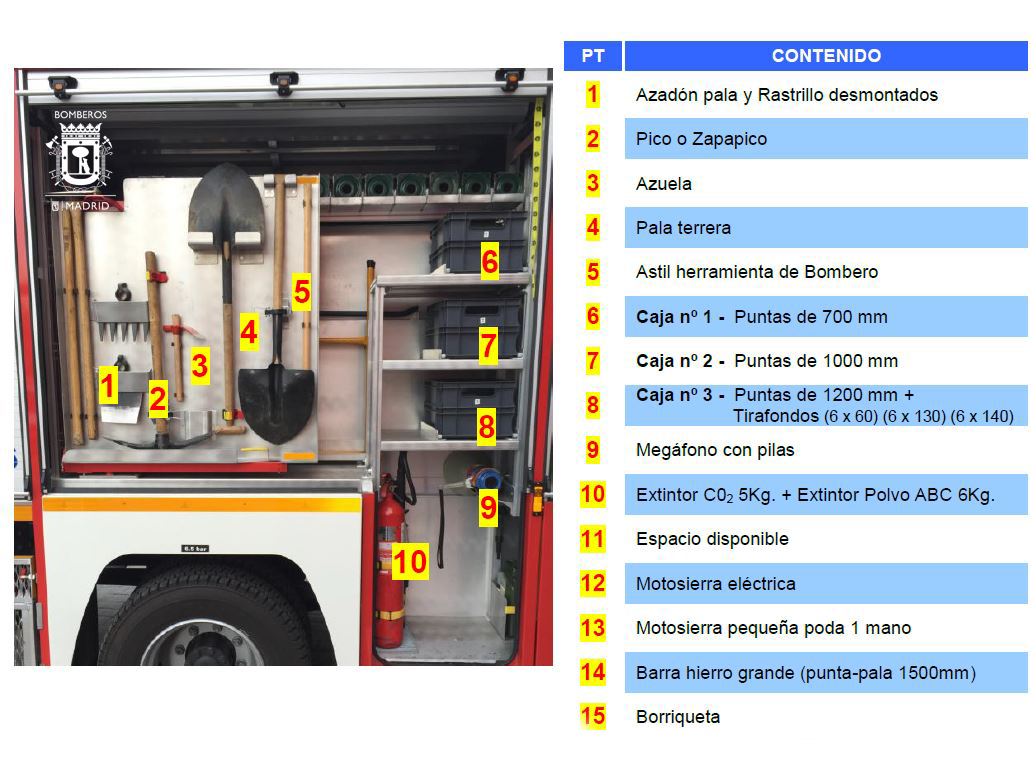Las fichas de revisión de equipos y herramientas d los vehículos; en imagen el Apeos, sirven para comprobar que todo el material esta disponible y que ocupa el sitio que le corresponde El orden ahorra tiempo de respuesta a la hora de actuar en una