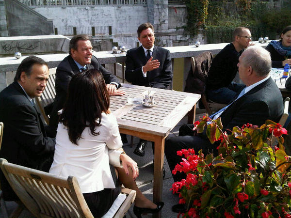 Nekdanji nemski kancler Gerhard Schroeder, EU poslanka @strankaSD @tfajon in @BorutPahor in gostje ob Ljubljanici ;)pic.twitter.com/AAaVCSJm