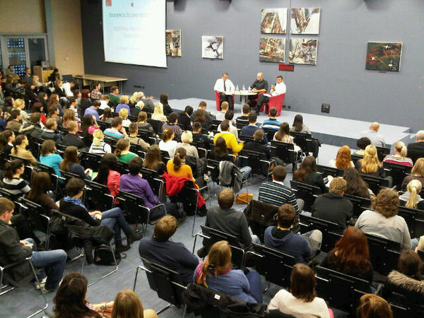 Predsednisko soocenje v nabito polni veliki dvorani FDV. V veliko cast nam je, da mladi zelijo slisati nasa stalisca :)pic.twitter.com/roq9NwBw