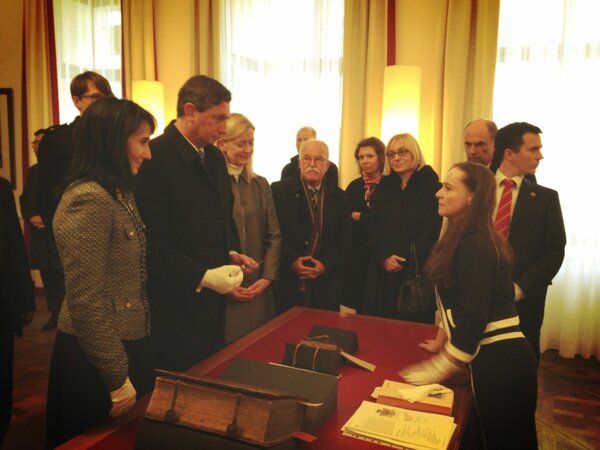 Predsednik republike in gospa Pečar v Avstrijski nac. knjižnici ob ogledu edinega izvirnika prve slovenske knjigepic.twitter.com/GYZaGCDq