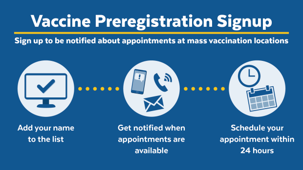 Today Massachusetts launched a preregistration tool to make it easier to request + book an appointment at the 7 mass vaccination locations. Eligible people will be contacted with an opportunity to book an appointment based on availability in your area.