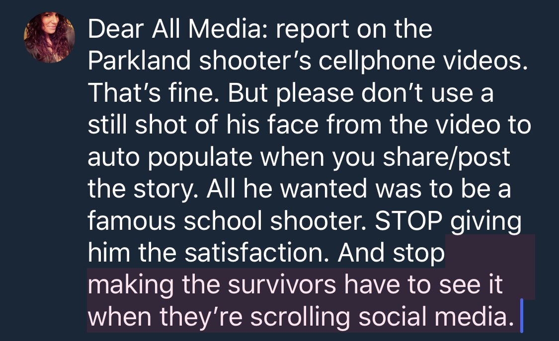 Please reconsider using the shooter's face. That's traumatic for those students who endured the violence he forced on them