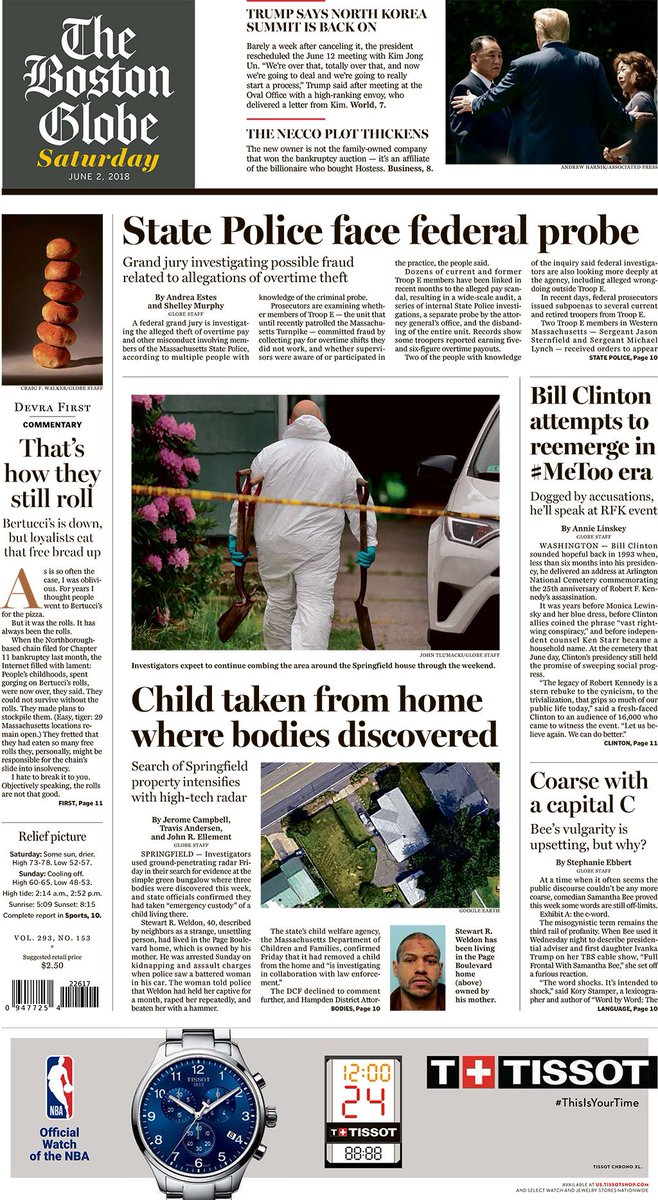 Today's Paper: State Police face federal probe, Bill Clinton attempts to reemerge in #MeToo era, child taken from Springfield home where bodies discovered, more. http://bos.gl/nA7jUsX pic.twitter.com/Sd5Ch7g51L