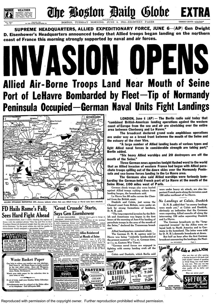Here's a look at how The Boston Globe covered the #DDay landings in Nazi-occupied France on June 6, 1944, at the time. http://bos.gl/SKvABiz pic.twitter.com/eN9EKDI2Oq