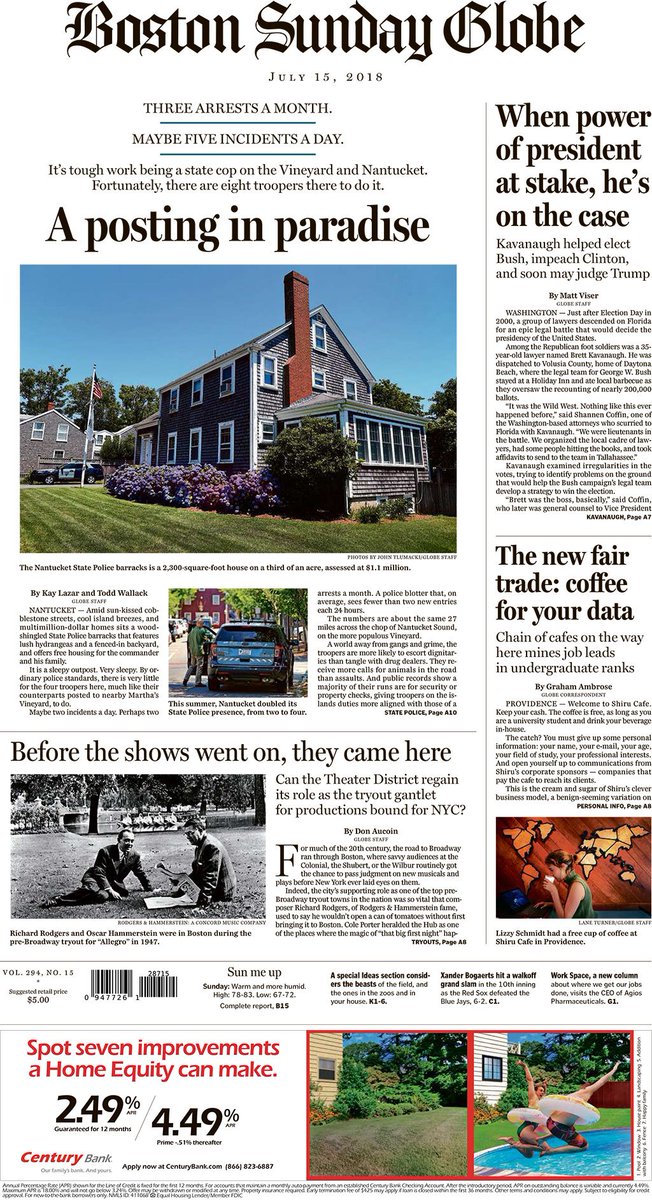 Today's Paper: A posting in paradise, president's powers hot topic for Kavanaugh, the new fair trade: coffee for your data, more. http://bos.gl/RmojcYP pic.twitter.com/qn8RmorQk5