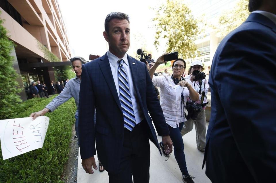 US Representative Duncan Hunter was swarmed by demonstrators yelling ‘‘shame on you!’’ as he left a federal courthouse Thursday in San Diego after pleading not guilty to charges of illegally using his campaign account for personal expenses. http://bos.gl/sGuUDPR pic.twitter.com/TemL4zqJAQ