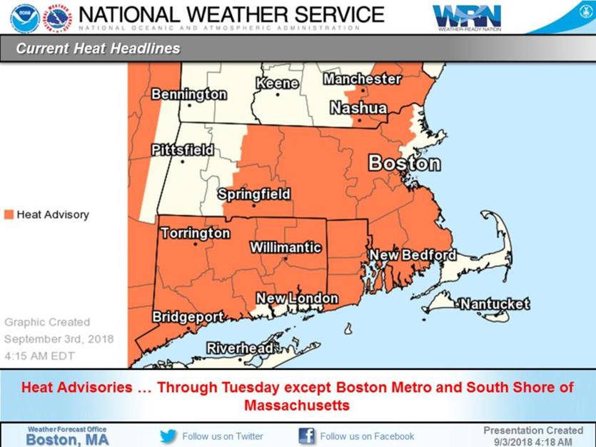 Heat advisories are in place for much of Mass. this Labor Day -- and the National Weather Service is warning people to limit strenuous outdoor activity as much as possible. http://bos.gl/l4qVJa5 pic.twitter.com/bVpJZ739xU