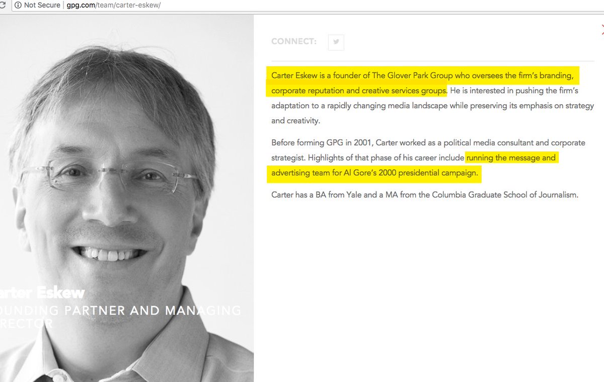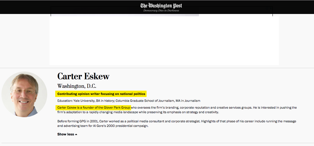 Indeed, not only does the Washington Post employ Ed Rogers, it also employs Carter Eskew, Founder and Managing Director of Glover Park, one of the biggest (if not the biggest) Saudi lobbyists, who still refuse to sever ties. How can the Wash Post keep them??? Just look: pic.twitter.com/tJqIjFUNBA