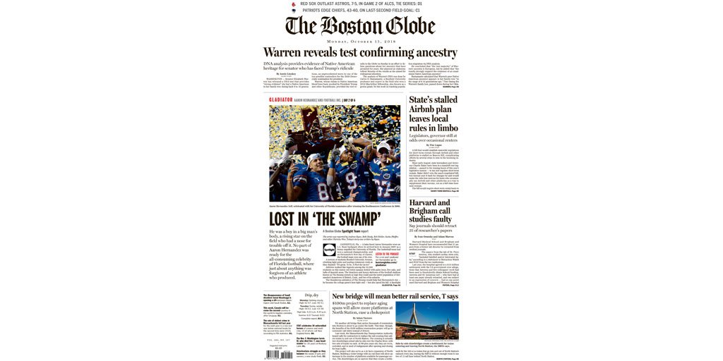 In today’s Globe: Warren releases DNA results, @GlobeSpotlight on Aaron Hernandez, Airbnb regulations in limbo. http://bos.gl/2fPQhAH pic.twitter.com/SgOCSmYwfq