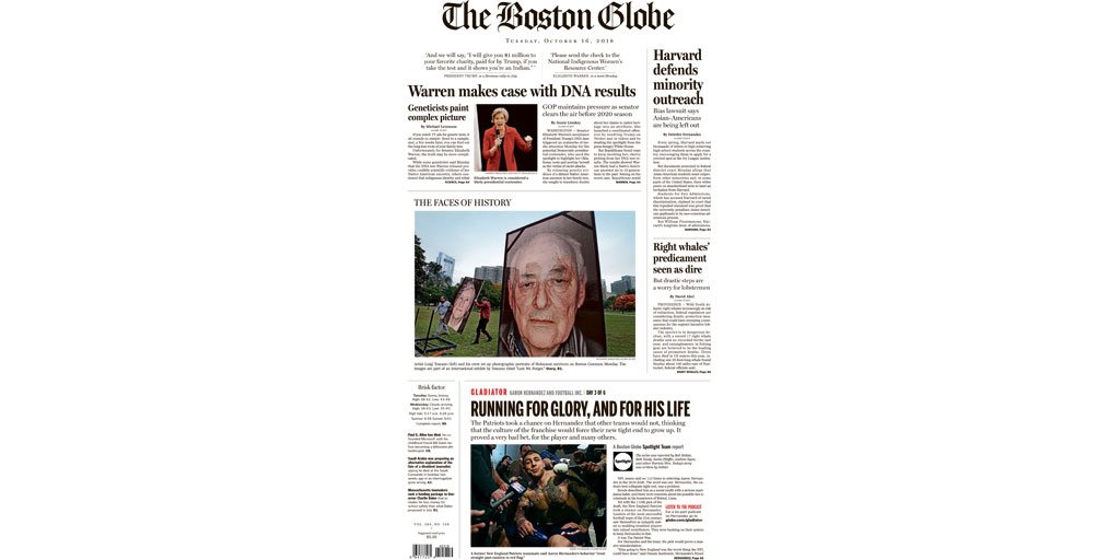 In today’s Globe: Warren’s DNA results, @GlobeSpotlight Hernandez series, Harvard defends admissions process. http://bos.gl/coZE3AV pic.twitter.com/BWzR0Wn2QT