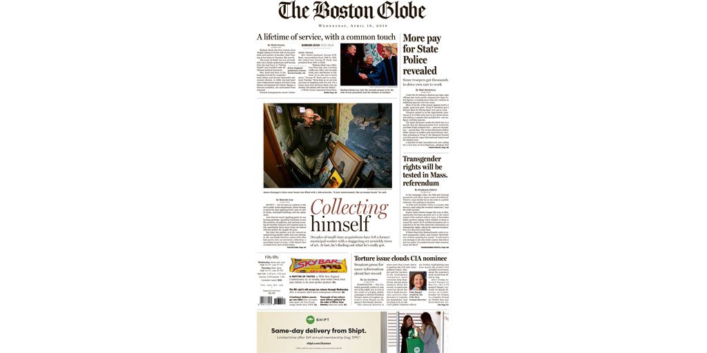 In today’s Globe: Barbara Bush dies, more State Police pay figures released, CIA nominee has a tough road ahead. http://bos.gl/fqXeINQ pic.twitter.com/WstOo0npVR