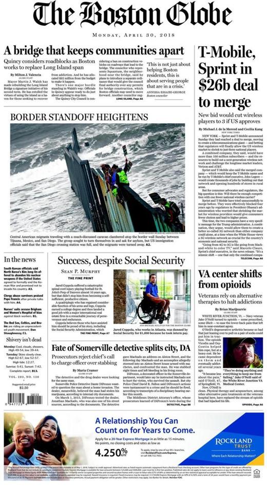 Today's Paper: A bridge that keeps communities apart; Border standoff heightens; T-Mobile, Sprint in $26b deal to merge; Success, despite Social Security; more. http://bos.gl/cLyoyCa pic.twitter.com/K9KvuZykZ3