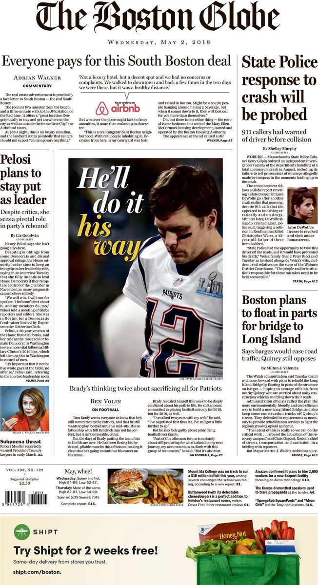 Today's Paper: State Police response to crash will be probed, Brady's thinking twice about sacrificing all for Patriots, Pelosi plans to stay put as leader, more. http://bos.gl/laHo1qQ pic.twitter.com/cA07yQVmQw