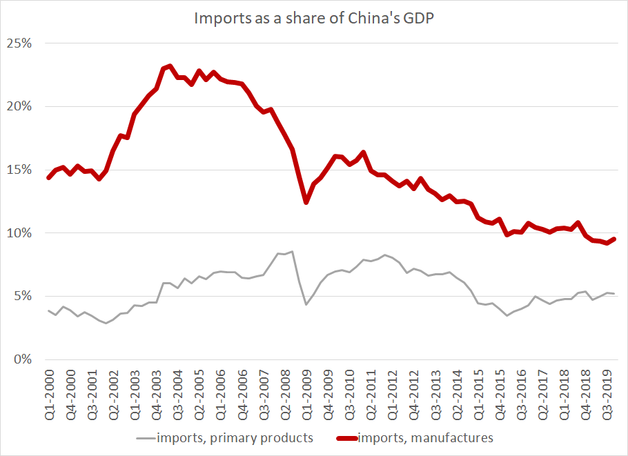 It is relatively easy to illustrate the enormous magnitude of China's trade. It is much harder to tell an equally important story (imo) -- namely that China's trade growth has actually lagged its GDP growth significantly (ratios are best done by graphs not photos ... )pic.twitter.com/8MnNkK6sqG