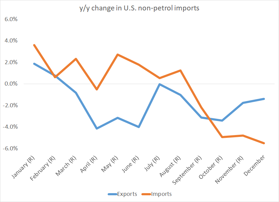 Charting today's trade data -- The big story is still the fall in non-petrol imports in the fourth quarter. Exports are pretty much on (a bad) trend. The fall in imports is bigger than easily can be explained, even with weak U.S. goods demand 1/xpic.twitter.com/73TbiqnxwZ