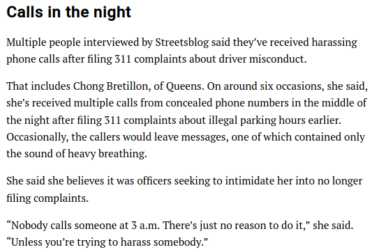 More documentation of harassing calls made to users of NYC's 311 system after they report illegal behavior by drivers, from