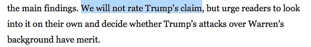 PolitiFact has never rated the Warren Cherokee lies. She has four "Mostly True" ratings and three "Half True".