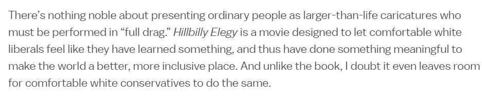 I have not seen Hillbilly Elegy but I can say with total confidence that nothing I have read in the absolutely scathing reviews making the rounds would have prevented it from being a massive critical and commercial success even ten years ago