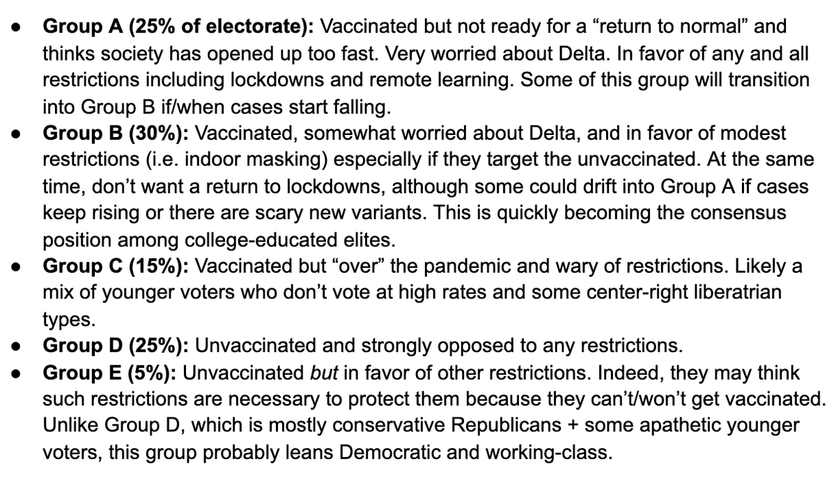 If you look at public opinion on COVID-related restrictions right now, it probably breaks down roughly into these 5 groups: pic.twitter.com/7CO1OIQI8H