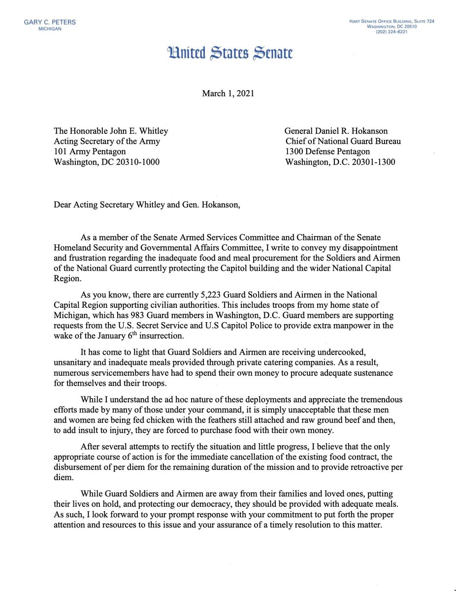 New this morning: @SenGaryPeters pens letter to Acting Secretary of the Army and Chief of National Guard Bureau. "I believe that the only appropriate course of action is for the immediate cancellation of the existing food contract, the disbursement of per diem..."pic.twitter.com/xikXzPz4Ni