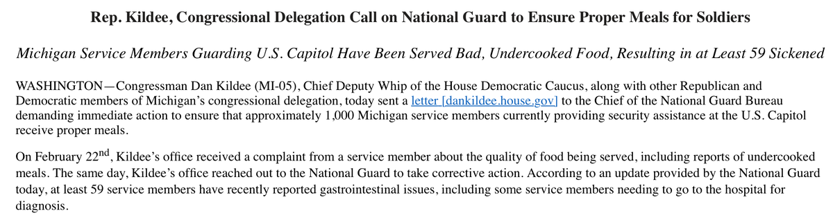 10 days left in the mission for Michigan National Guard members in DC. Today - a bipartisan letter from Michigan's congressional delegation, echoing Sen. Peters, calling for the food contract to be voided/substituted, and per diem given to soldiers for their remaining time.pic.twitter.com/qfxGaKn3ua